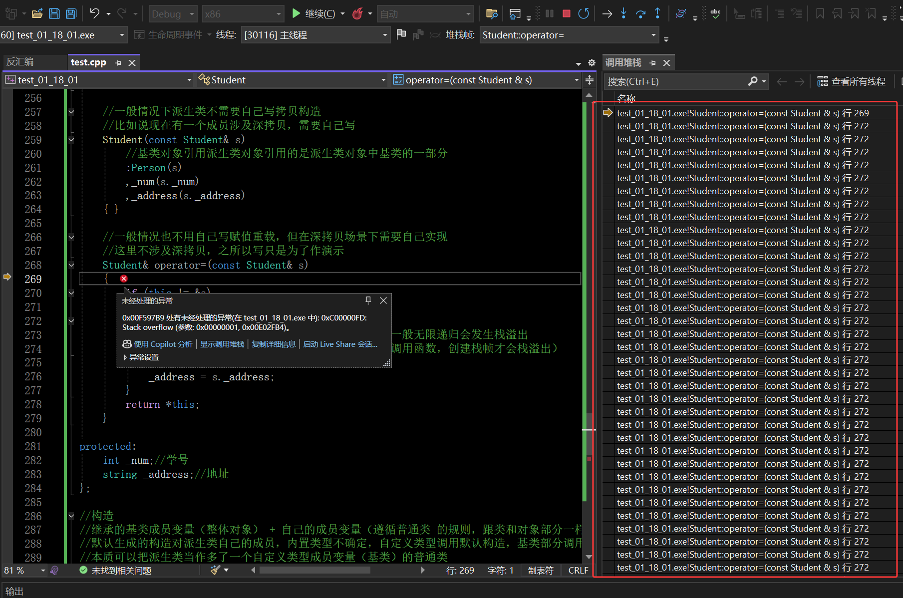 // 原因:派生类的operator=隐藏了基类的,直接调用会递归调用自己,导致栈溢出