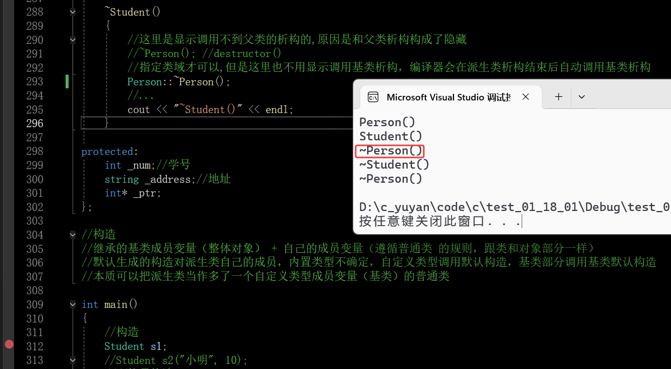 - ✅ 清理顺序验证:s1 销毁时,先执行 ~Student()(打印 ~Student()),然后编译器自动调用 ~Person()(打印 ~Person()),符合 "先派生后基类" 的清理顺序。