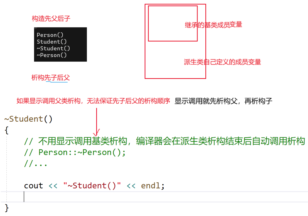 - 派生类析构完成后,编译器会自动调用基类析构,保证清理顺序:先派生类成员 → 再基类成员;