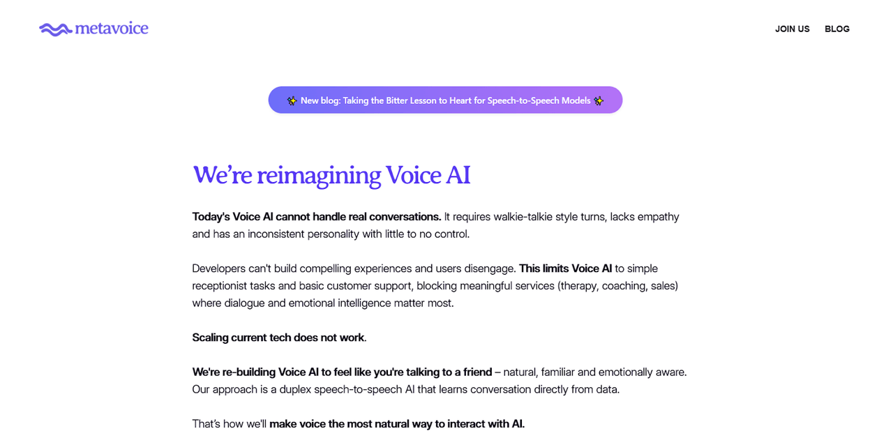 MetaVoice 是一款注重语音真实性和情感表达的 AI 语音变换工具,主要面向短视频内容,包括营销短片、解说视频和旁白等。