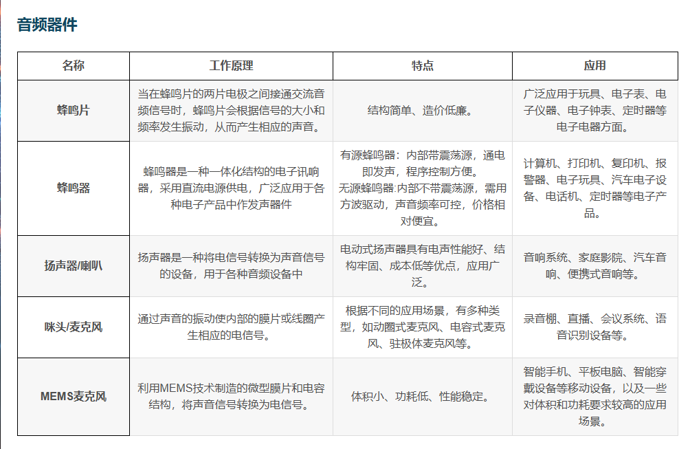 音频器件是指用于处理、传输、放大或转换音频信号的电子元件或设备。它们在音频系统中起着关键作用,广泛应用于音乐播放、录音、通信、广播、影视制作等领域。以下是音频器件的一些主要类型及其简述: