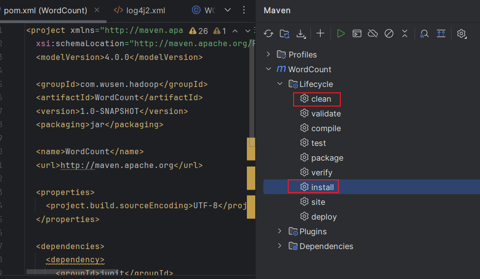2.用maven打jar包,然后拷贝到Hadoop集群中node1的/root目录下。 步骤详情:maven->clean-> install。等待编译完成就会在项目的target文件夹中生成jar包。如果看不到。在项目上右键->Refresh,即可看到。修改不带依赖的jar包名称为wc.jar,并拷贝该jar包到Hadoop集群。
