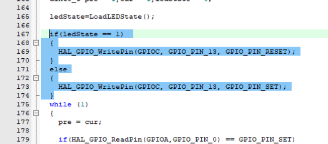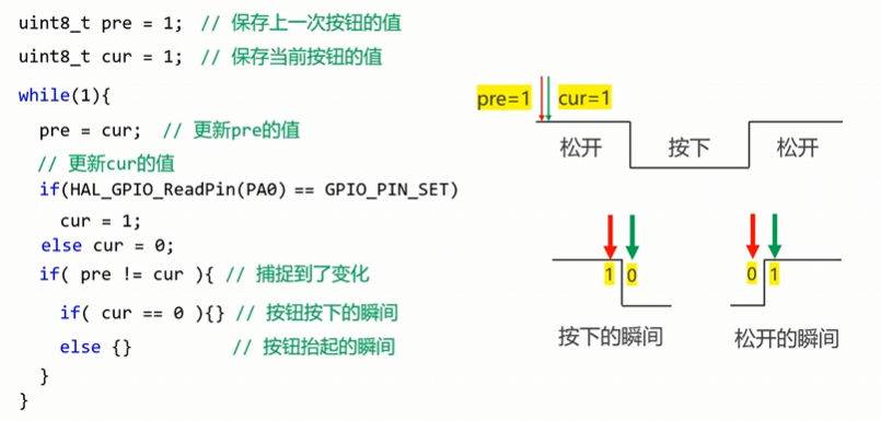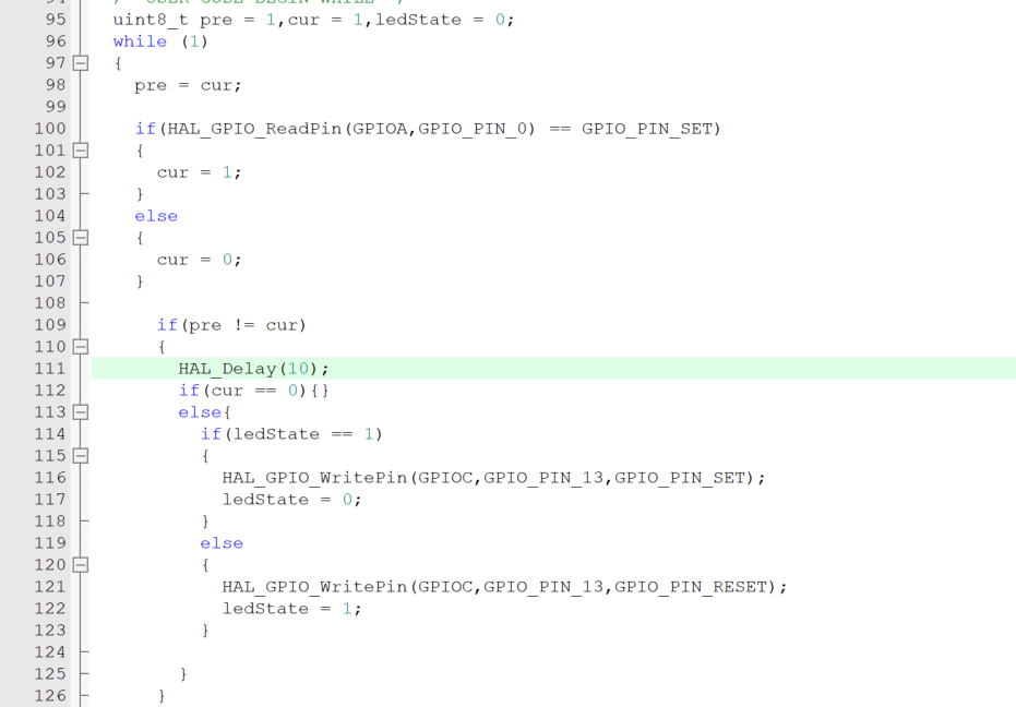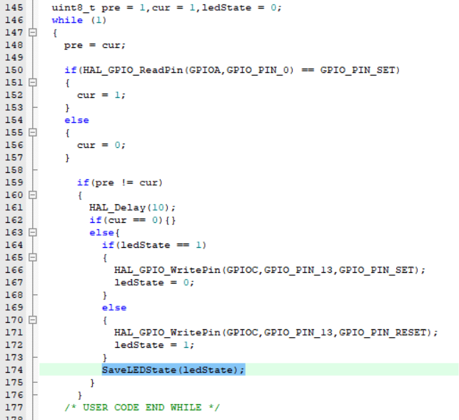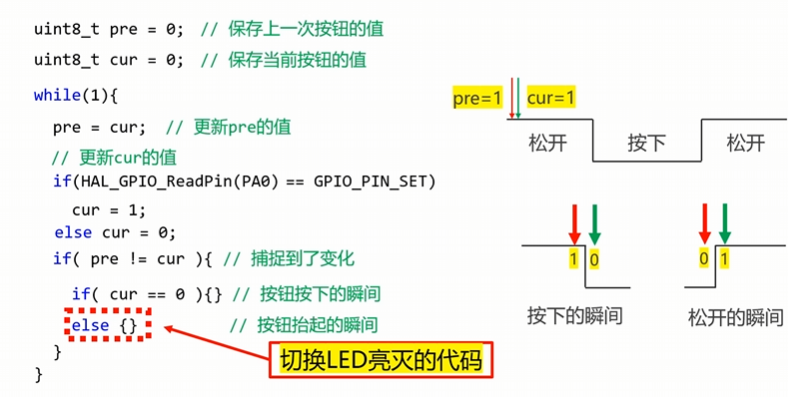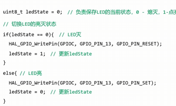 当按钮抬起时,切换LED灯的亮灭状态后,我们还需要保存LED灯的亮灭状态