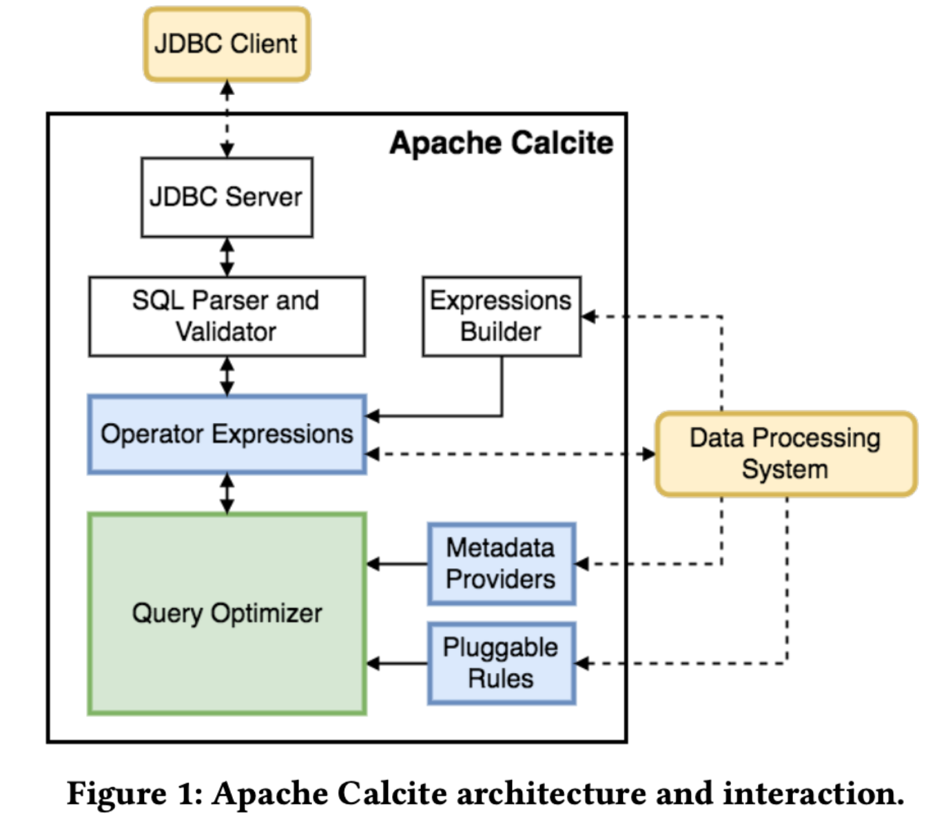 - 关注点分离:Calcite 专注于 SQL 处理逻辑,将存储和计算交给外部系统