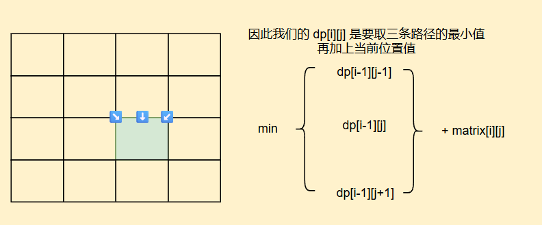 dp[i][j] = Math.min(Math.min(dp[i-1][j-1],dp[i-1][j]),dp[i-1][j+1])+matrix[i-1][j-1];