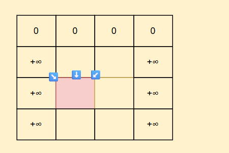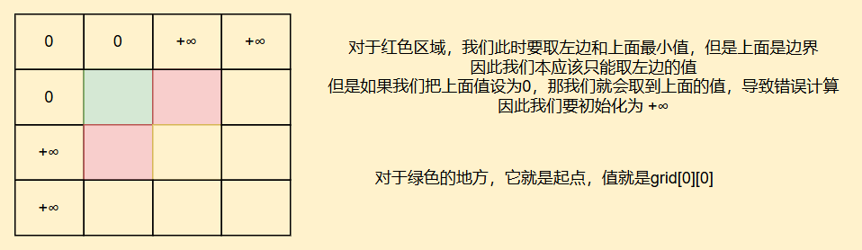 好,我们接下来看初始化,这个初始化特别讲究,我们还是使用辅助行和列进行初始化,当填表在左边界的时候,因为需要左上角,上面,右上角三个地方进行最小值取值,如果我们把边界初始化为0的话,这样最小值比较就会把这个边界0算进去,影响最后判断,因此我们要初始化为+∞,右边界也是一样的道理