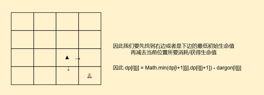 也就是说,我们到达[i,j]位置骑士的生命值并不只取决于整体的初始状态,还跟从上面来和从左边来的状态有关