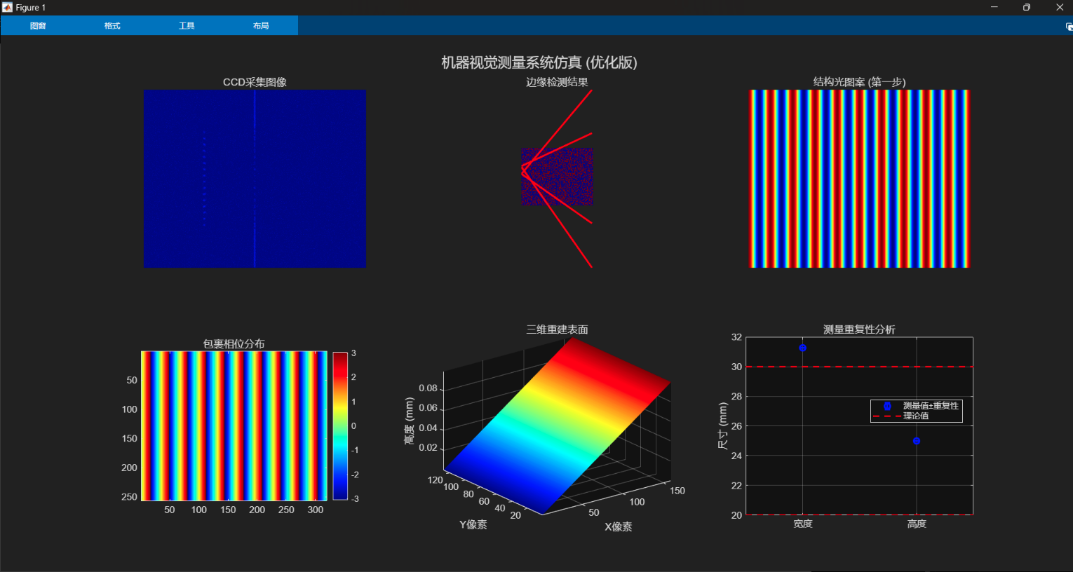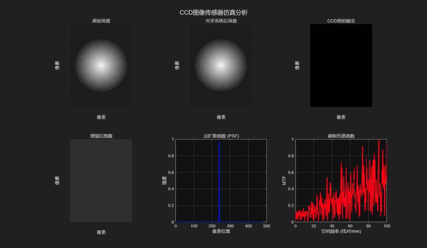 将显示一个2行×3列的子图布局,总标题为"CCD图像传感器仿真分析"。
