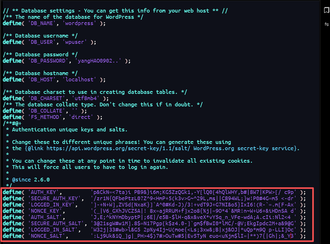 访问 https://api.wordpress.org/secret-key/1.1/salt/ 复制生成的密钥,替换wp-config.php中的相应部分。复制双引号内部内容