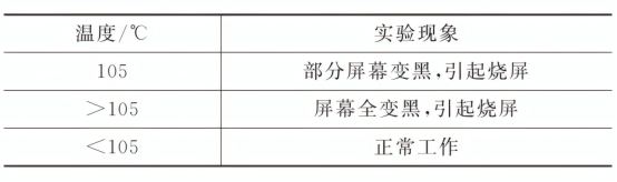 温度测试表明,TFT 屏 在 105℃时部分区域变黑,超过 105℃则全黑烧屏,低于 105℃ 时正常工作。为保证使用安全性,预留一定余量后,将100℃ 标定为阳光倒灌引发烧屏的温度临界值。