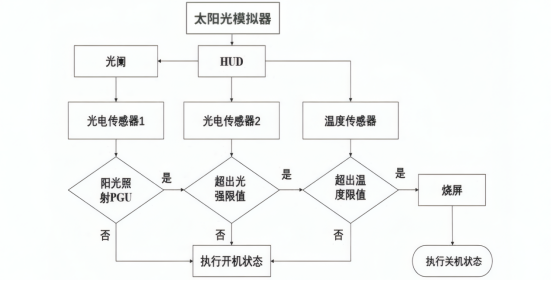本方案采用 "专用光阑 + 双光电传感器 + 多温度传感器" 协同探测,结合太阳光模拟器 提供稳定光源:专用光阑安装于一级反射镜 后,可筛选特定方向光线,减少杂光干扰;光电传感器一配合光阑,依据屏内外信号幅值差异,检测倒灌光斑 是否落在 TFT 屏内;光电传感器二探测 HUD 内部光强 ;多温度传感器监测屏体温度。当光电传感器一读数 Y₁>A、光电传感器二读数 Y₂>B 且温度传感器最大读数 Tmax>C (A、B、C 为实验标定值)时,判定为烧屏风险,可通过软件控制 HUD 关机规避。