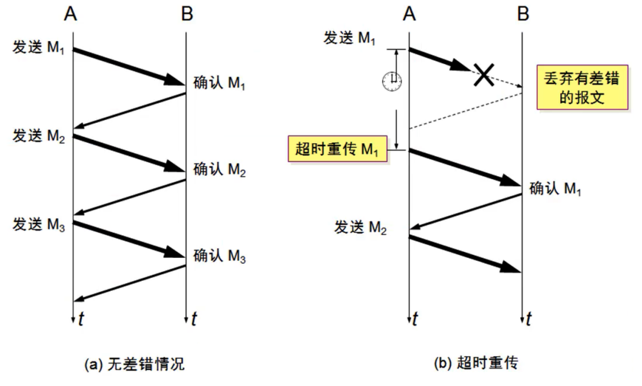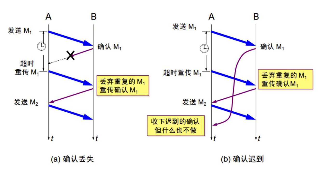 我们可以看到下图左边对比上图的区别其实就是,B有没有收到,而A是肯定没收到,此时我们A重传后,区别于上图的就是我们会让B把之前A给的M1包丢掉,然后重传确认M1。