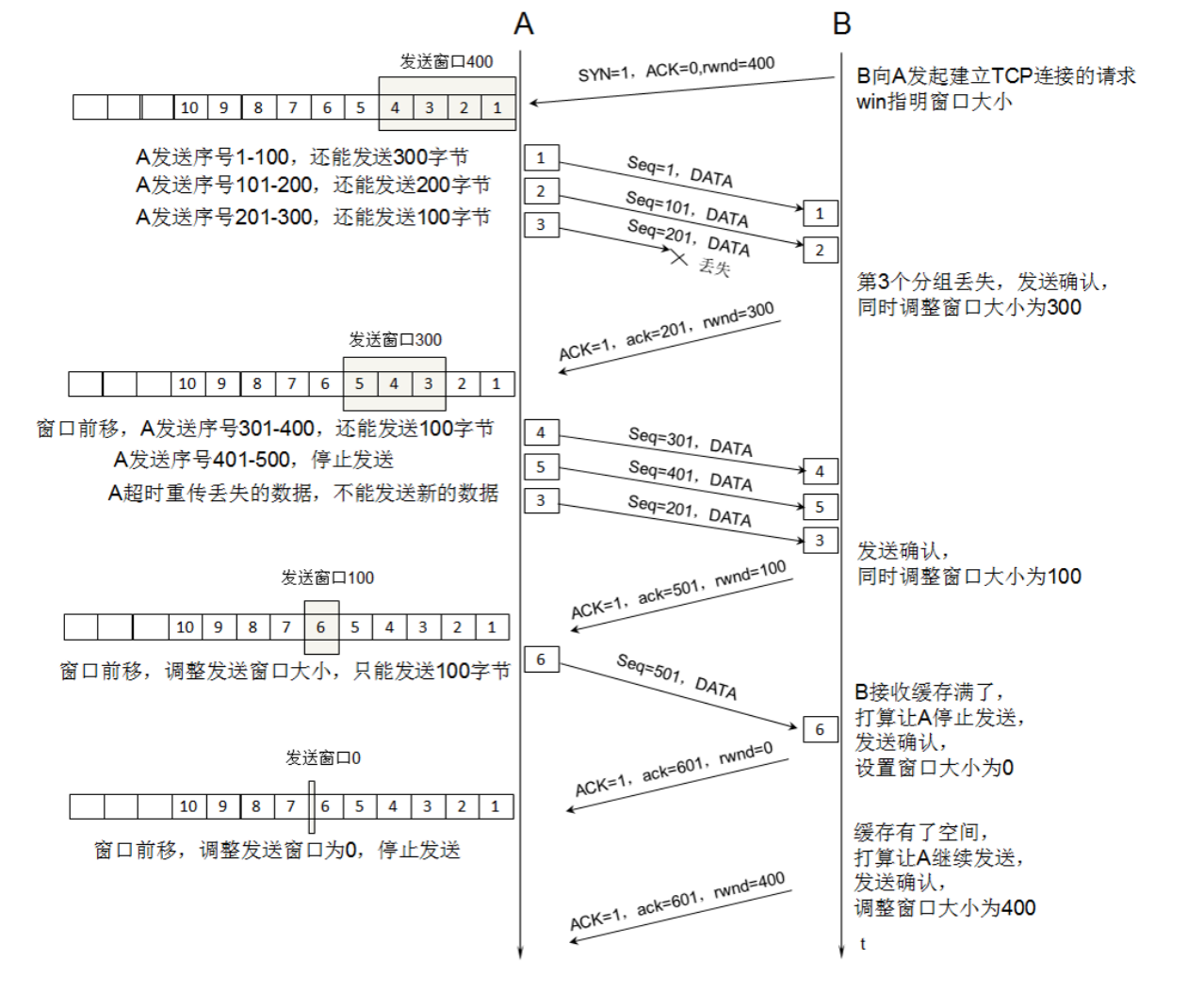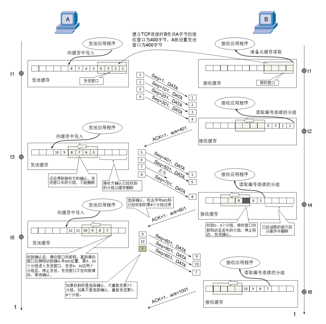 我们看此图,**1>**B告诉A接收窗口是400字节,A就设置发送窗口为400字节,然后我们就按照一个包一个包的编号,然后就发过去。2>发过去之后就可以看到,我们的接受应用程序会读取接受缓存区里的数据,当然也是按照接收窗口的大小来读 ,当读完后,就会发现我们的接受窗口就移动到下一个地方了,这也是读完后的标志,然后我们接收端就会回ack 。3> 发送端收到确认包后发送端就将之前的分组从缓存区中删除。然后进行窗口滑动和调整窗口,并且我们发送应用程序也在不断的往缓存区里写入东西。最后我们继续按照确认包的确认号组成序号进行发送。4> 我们窗口在滑的过程中发现少了第7个包后,我们就要发一个确认包,让发送方把第7个包补发过来,且会说明已经收到第8个包。5> 然后发送方就会把该包发过去,然后按照窗口的位置继续发送。(这里怕有些人误会,这里的图中7包是在最低下的,但其实这个位置跟发送先后没关系,按理来说7包甚至是最早发的,放在下面只是好写注释)那么后面就不断地按照流程去做就完了。