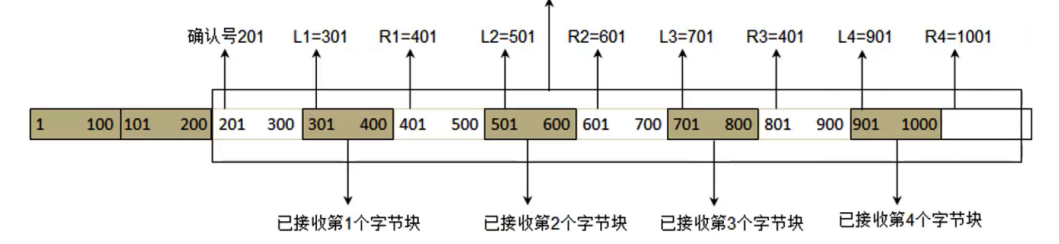 可以看到,下图我们棕色方块的都是已经收到的数据段,而白色是丢包的,比如我们201~300的包没了,那么右边界和左边界分别就是201和301,也就是左闭右开的一个区间,然后让我们接受端去看这个信息,而上图就是我们的存储左右边界的格式。