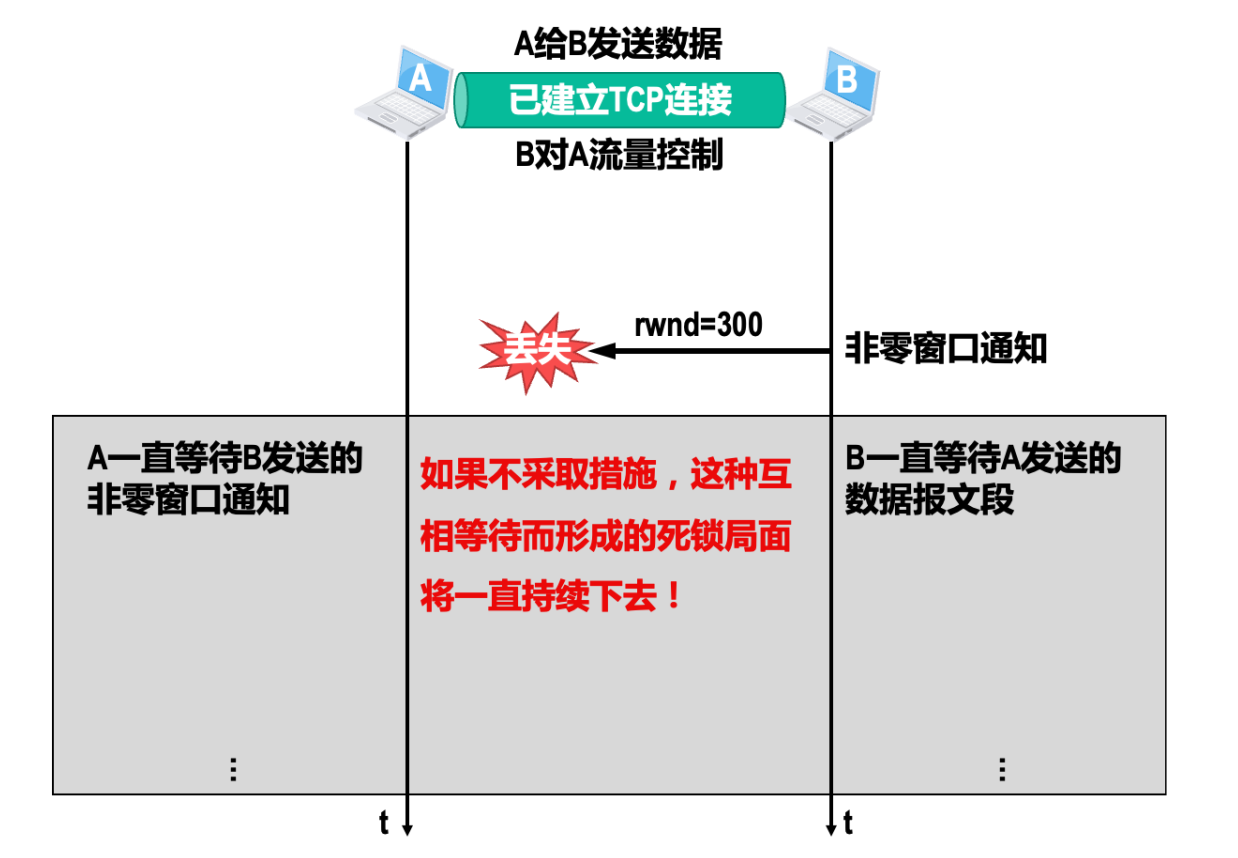 一开始,接收方给发送方发送了0窗口的报文段,后面,接收方又有了一些存储空间,给发送方发送的非0窗口的报文段丢失了,发送方的发送窗口一直为零,双方陷入僵局。