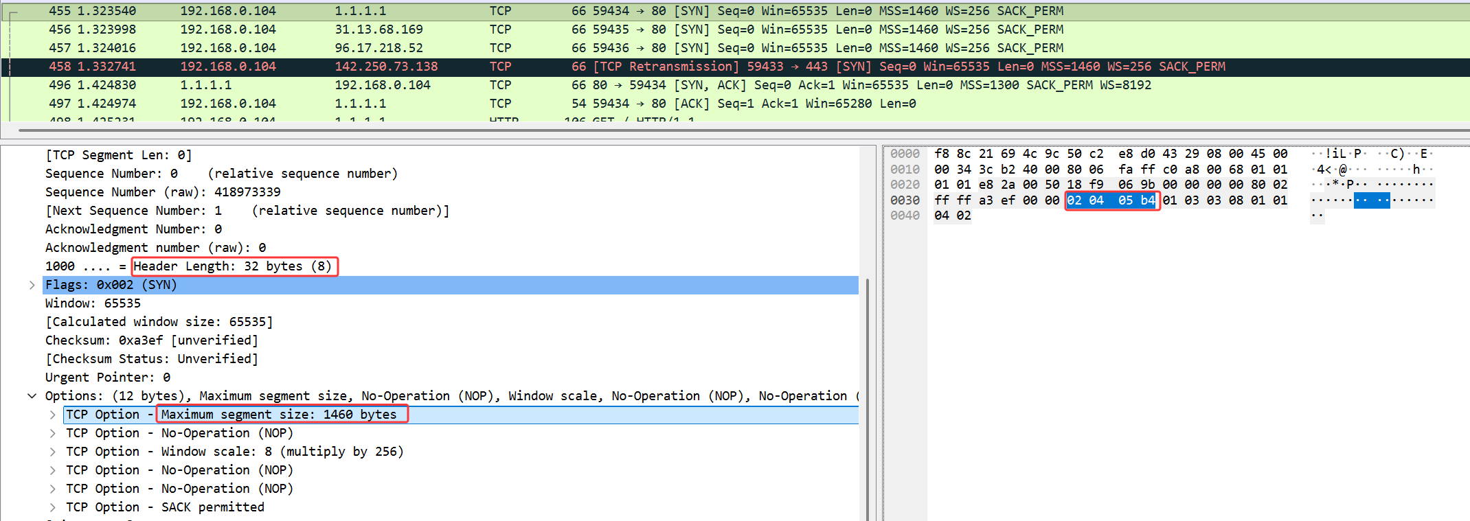 我们现在来个大家抓个包看一下,可以看到这是一个大小为32字节的TCP报文段,也就是说此报文段的选项字段是有内容的,而我们的窗口大小的字段就在我们的选项字段中 ,可以看此时说的MSS,也就是最大段尺寸是1460字节。
