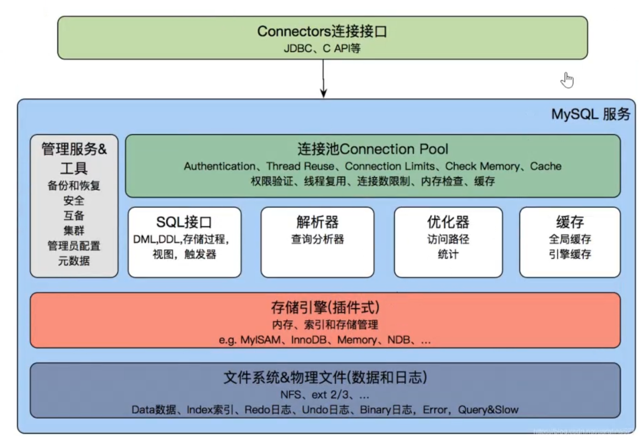 - 一条 SQL 查询的完整执行流程:客户端 → Connectors → 连接池认证 → SQL 接口 → 解析器 → 优化器 → 执行器 → 存储引擎 → 文件系统 → 返回结果。