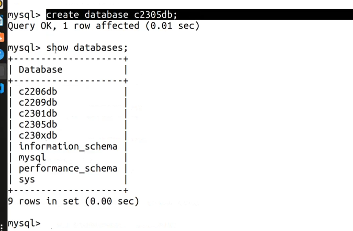 +--------------------+ | Database | +--------------------+ | c2206db | | c2209db | | c2301db | | c2305db | ← 你刚刚创建的数据库,已出现在列表中 | c230xdb | | information_schema | | mysql | | performance_schema | | sys | +--------------------+ 9 rows in set (0.00 sec)9 rows in set:现在总共有 9 个数据库,比之前的 8 个多了 1 个,正好对应你新创建的c2305db。- 这一步的作用是验证创建操作是否成功,确保新数据库已经被正确添加到服务器中。