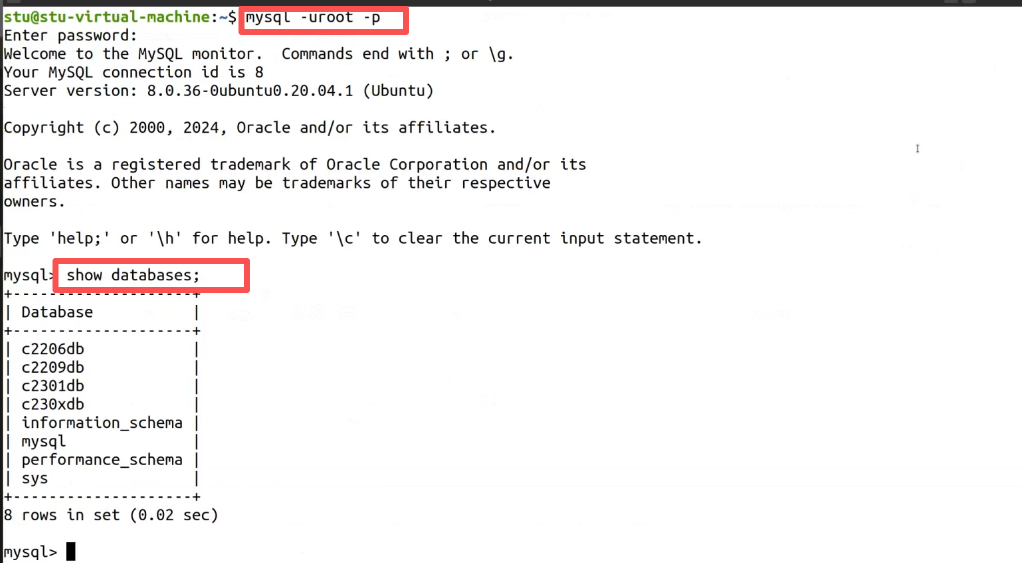 mysql:调用 MySQL 客户端程序-uroot:使用root用户登录(-u后面跟用户名)-p:表示需要输入密码(密码不会明文显示,输入后按回车即可)- 执行后出现