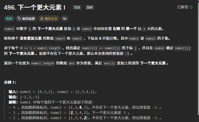 在栈非空且遍历到的元素大于栈顶元素时,也即找到了该栈顶元素的最近的较大数,不断查找栈顶元素在nums1中是否存在,存在的话就存储到结果中。