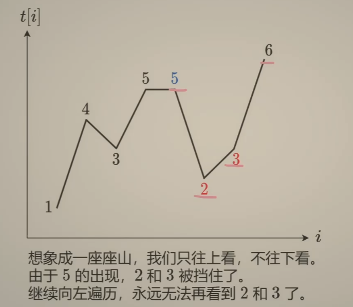 此时栈顶的温度并非最高,由于是从后向前遍历,也即存在栈顶元素之前的某一天,温度高于栈顶,如下图的5和2,也即2不会对前面的时间产生影响(不会成为前面日子升高气温的某一天,因为5代替了他的效果)。因此,pop()掉没有第i日高的温度。