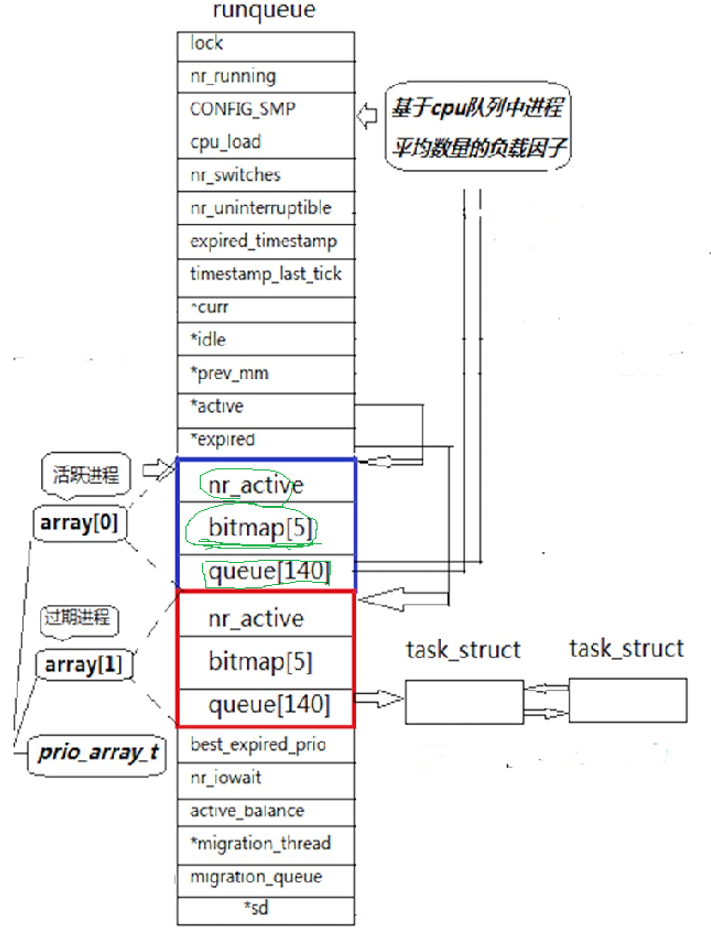 *我们主要关注*active,expired,nr_active,bitmap[5],qunue[140]
