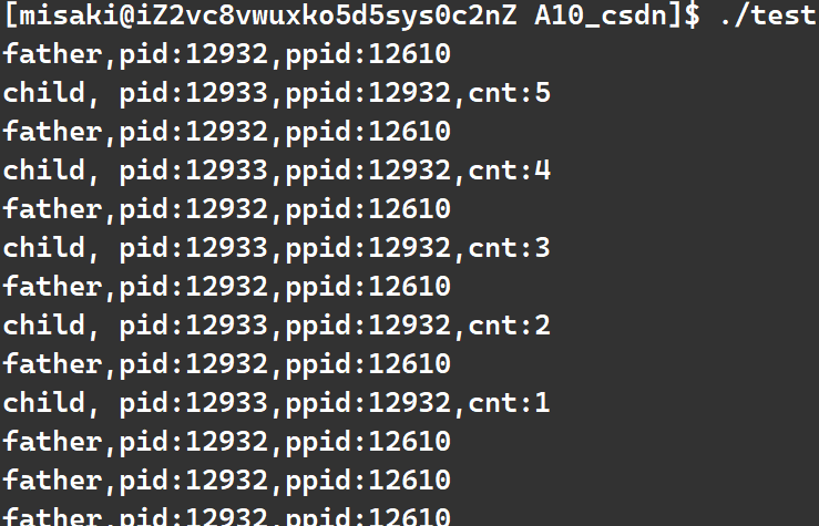 下面我们在让子进程打印一下自己的pid信息,并通过sleep等待缓慢打印结果。