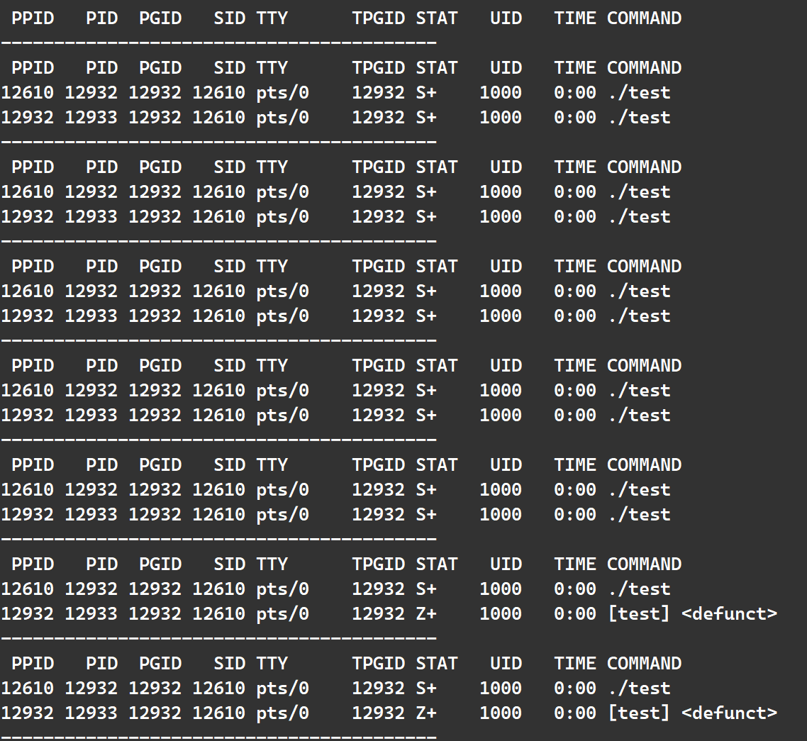 while :; do ps ajx | head -1 && ps ajx | grep test |grep -v grep; sleep 1;echo "-----------------------------------------";done