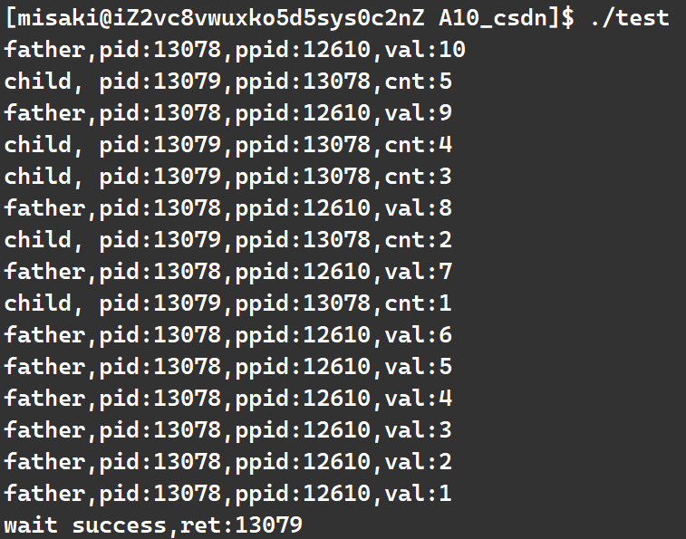 并且我们中途也不进行等待sleep(10),直接让父进程进入等待,那么:
