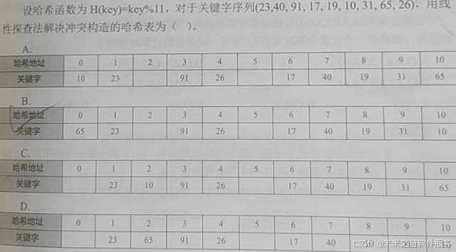 -23%11=1 → 地址 1-40%11=7 → 地址 7-91%11=3 → 地址 3-17%11=6 → 地址 6-19%11=8 → 地址 8-10%11=10 → 地址 10-31%11=9 → 地址 9-65%11=10 → 地址 10(冲突)-26%11=4 → 地址 4
