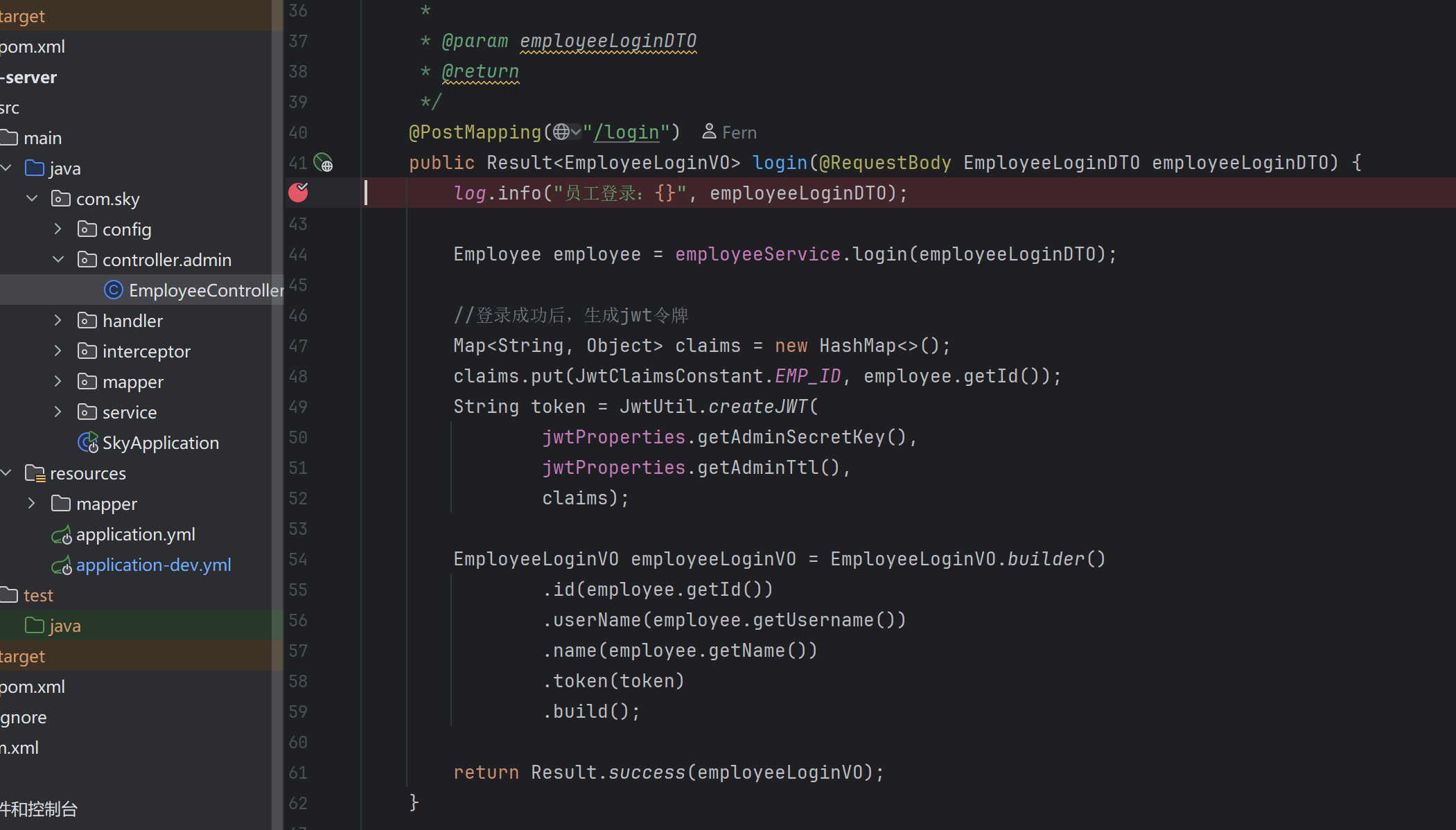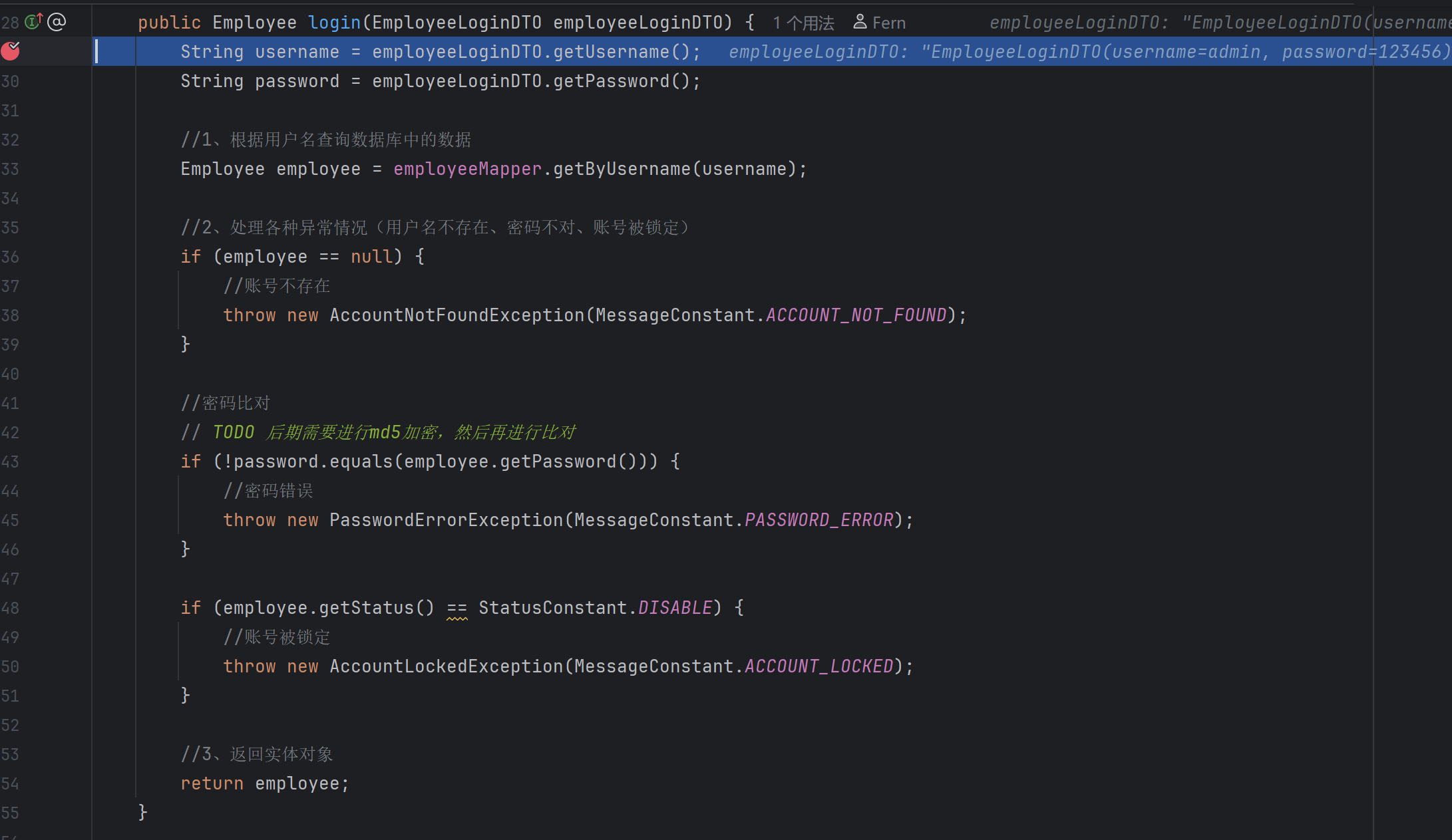 Employee employee = employeeService.login(employeeLoginDTO);调用service 层的登录方法
