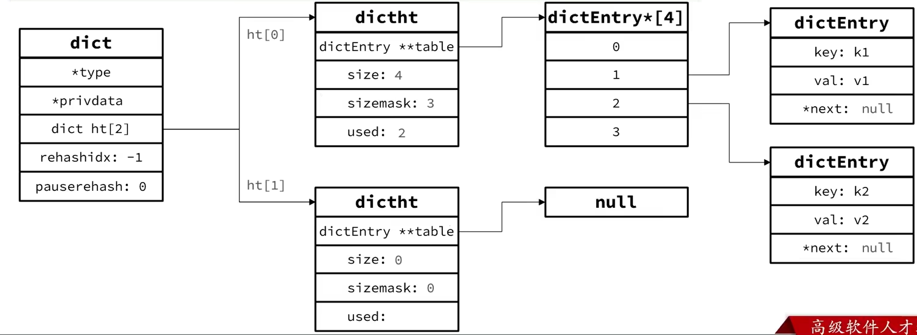 dictht ht[2];// 一个Dict包含两个哈希表,其中一个是当前数据,另一个一般是空,rehash时使用