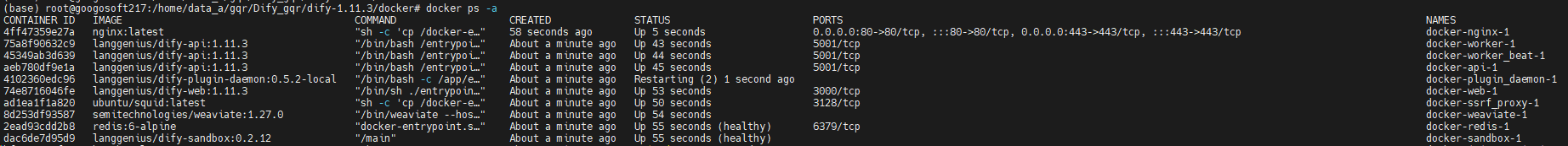 思路是:在可以联网的服务器上运行Dify,使用docker ps指令查看dify运行后启动的哪些容器(不同的Dify版本依赖的镜像版本也不同,根据实际情况):