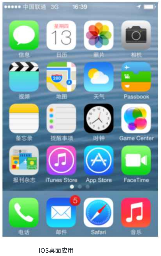 - IOS 桌面应用:包含信息、日历、照片、相机、视频、地图、天气、Passbook、备忘录、提醒事项、时钟、Game Center、报刊杂志、iTunes Store、App Store、FaceTime、电话、邮件、Safari、音乐等应用。