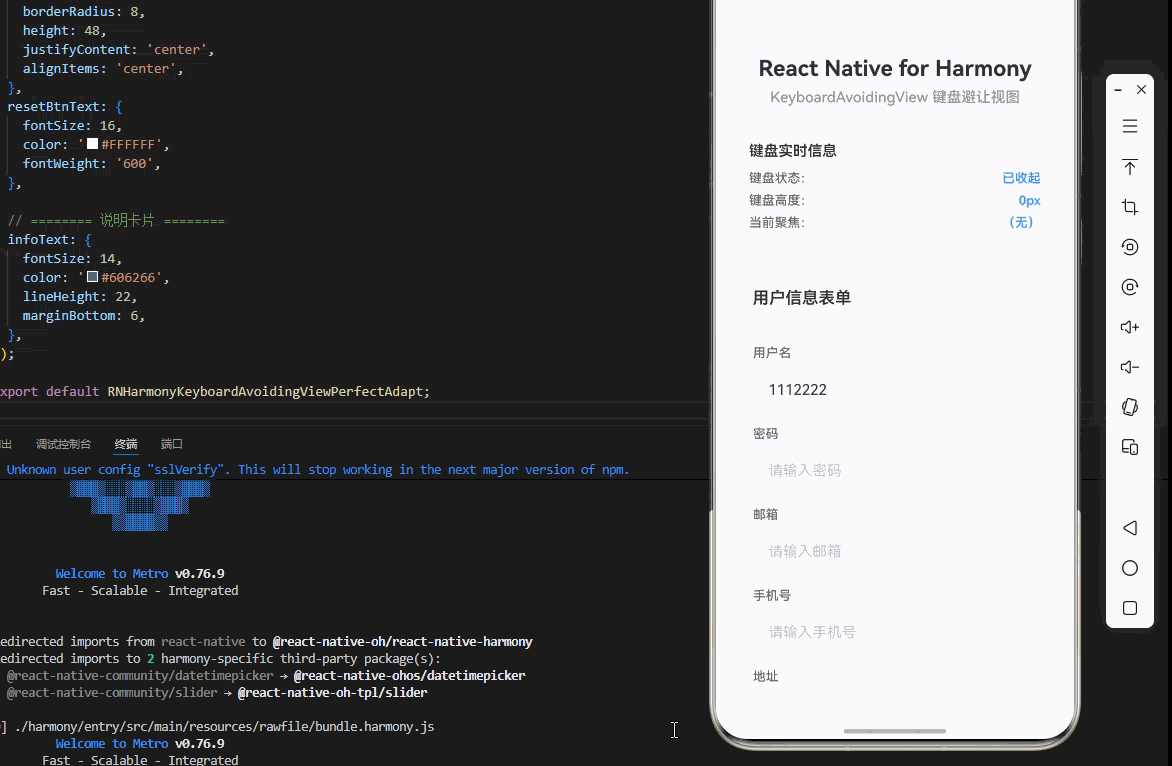KeyboardAvoidingView 是 React Native 提供的一个容器组件,用于解决键盘弹出时遮挡输入框的问题。当软键盘弹出时,KeyboardAvoidingView 会自动调整其子组件的位置,确保输入框始终可见。这个组件在移动应用中非常重要,特别是在表单输入、聊天界面等场景中。KeyboardAvoidingView 完全支持鸿蒙系统。