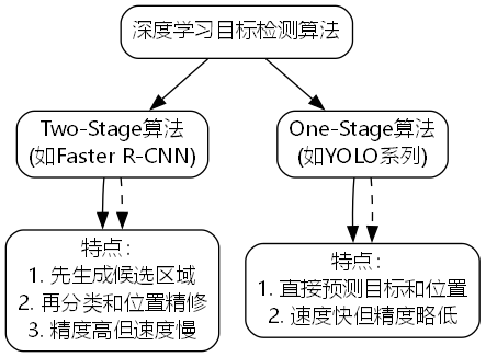 深度学习目标检测算法主要分为两大类:Two-Stage和One-Stage算法。Two-Stage算法如Faster R-CNN首先生成候选区域,然后进行分类和位置精修,精度高但速度较慢;One-Stage算法如YOLO系列直接预测目标和位置,速度更快但精度略低。
