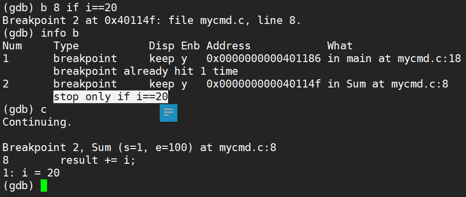 - 条件断点:break/b 行号 if 条件(给断点添加条件,满足条件时触发断点)