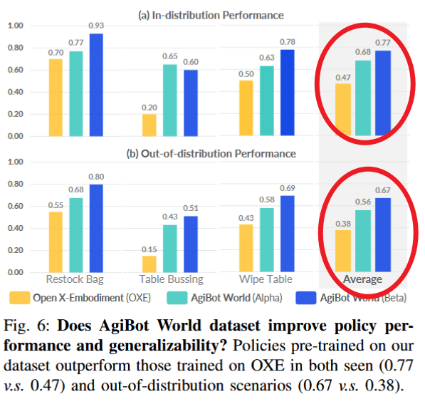 - 结果: 在 AgiBot World 上预训练的策略显著优于在 OXE 上训练的策略