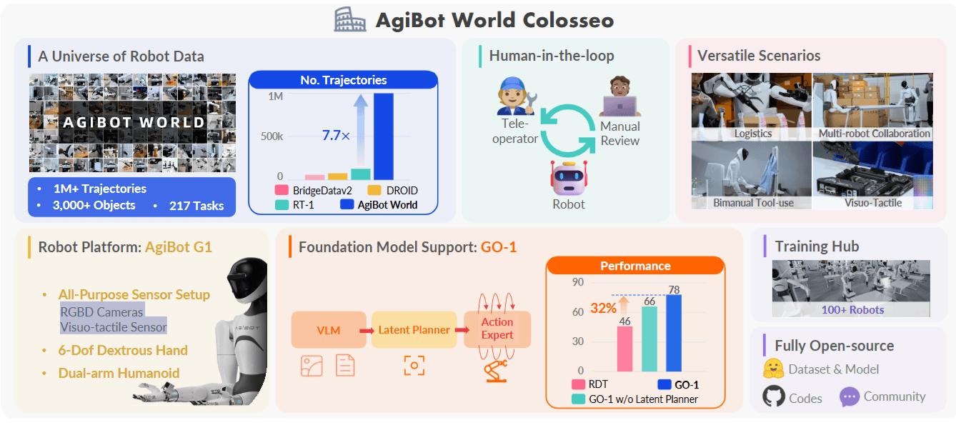 - AgiBot World 平台: 1M+轨迹、217任务、5类部署场景,规模较主流数据集(如 OXE)高一个数量级