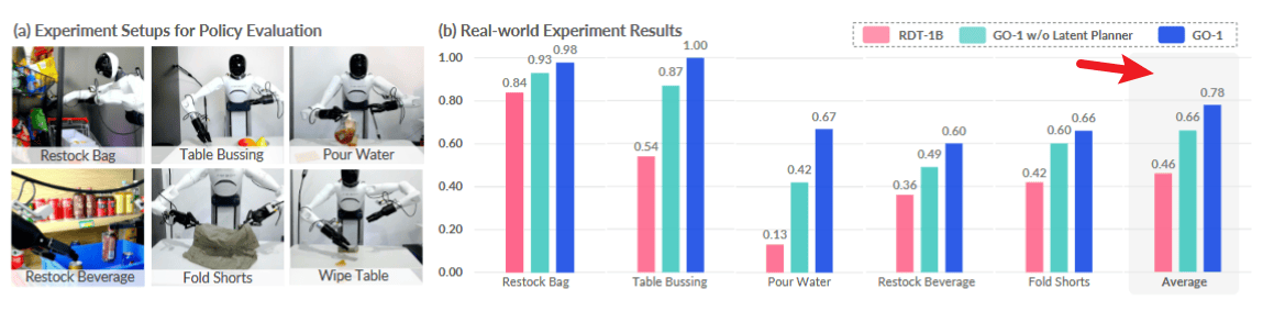 - 结果: GO-1 在所有任务中均大幅超越 RDT-1B 与不带潜在规划器的变体