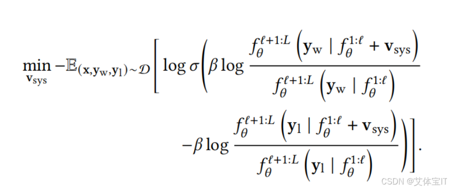 那么这个优化函数的目的是找到一个系统向量,将其加入到模型的中间特征之后,模型生成偏好性回复的概率加大,而非偏好性回复的概率降低。这个系统向量就会成为我们需要的那个能够代替文本提示词的关键向量。