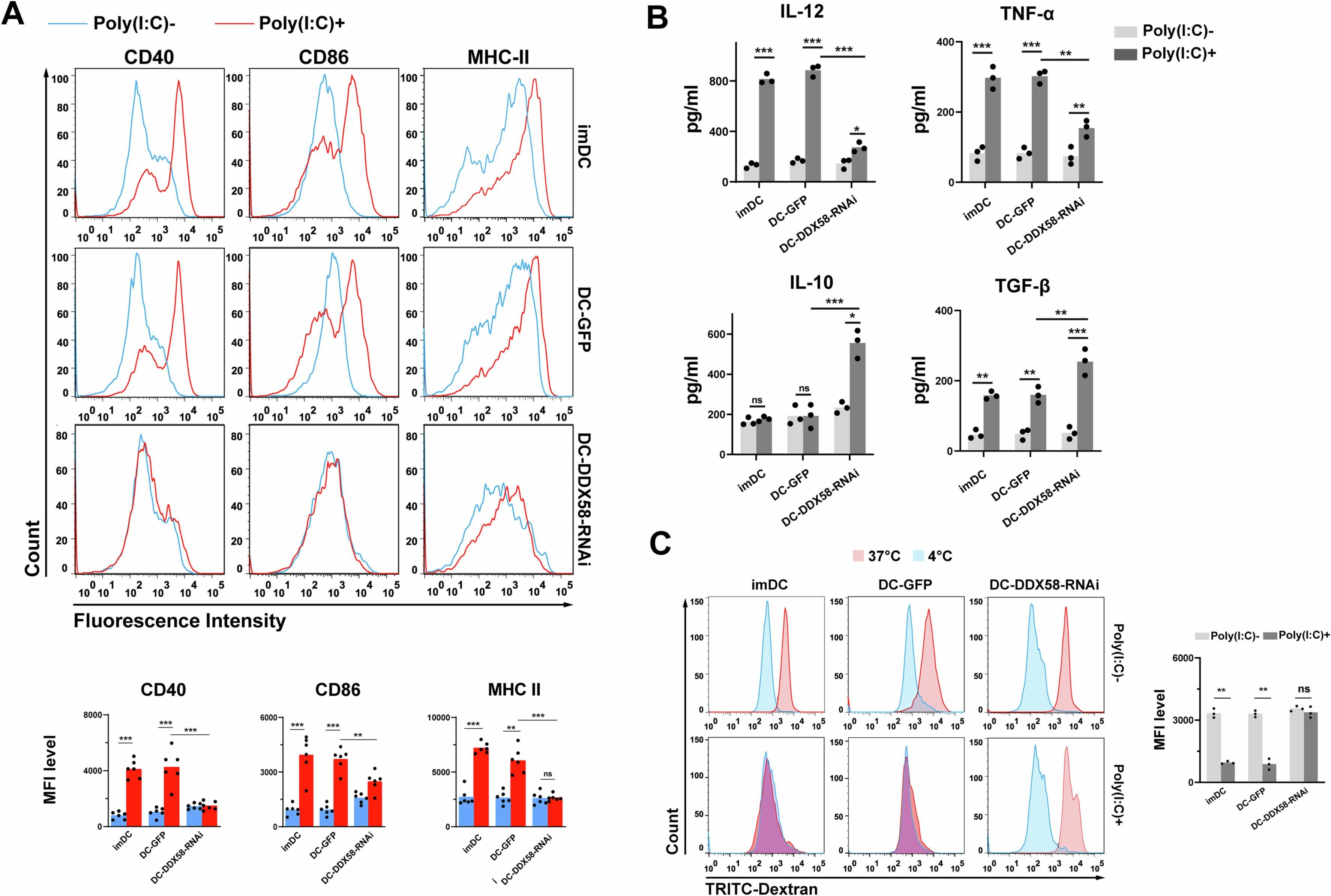 中山大学第一附属医院的科研团队在上述论文中使用了AbMole的Poly I:C (Polyinosinic:polycytidylic acid,AbMole,M5062),以探究视黄酸诱导基因1(RIG-1)在DC(树突细胞)活化和成熟中起关键作用。研究结果表明,抑制RIG-1表达能够阻止DC的成熟,使其保持未成熟状态,表现为共刺激分子和主要组织相容性复合体(MHC)表达水平降低,吞噬能力增强,同时分泌更多的抗炎细胞因子(如IL-10和TGF-β)和更少的促炎细胞因子(如IL-12和TNF-α)。Poly(I:C)被用作RIG-1的激动剂,用于RIG-1对DC成熟的影响。