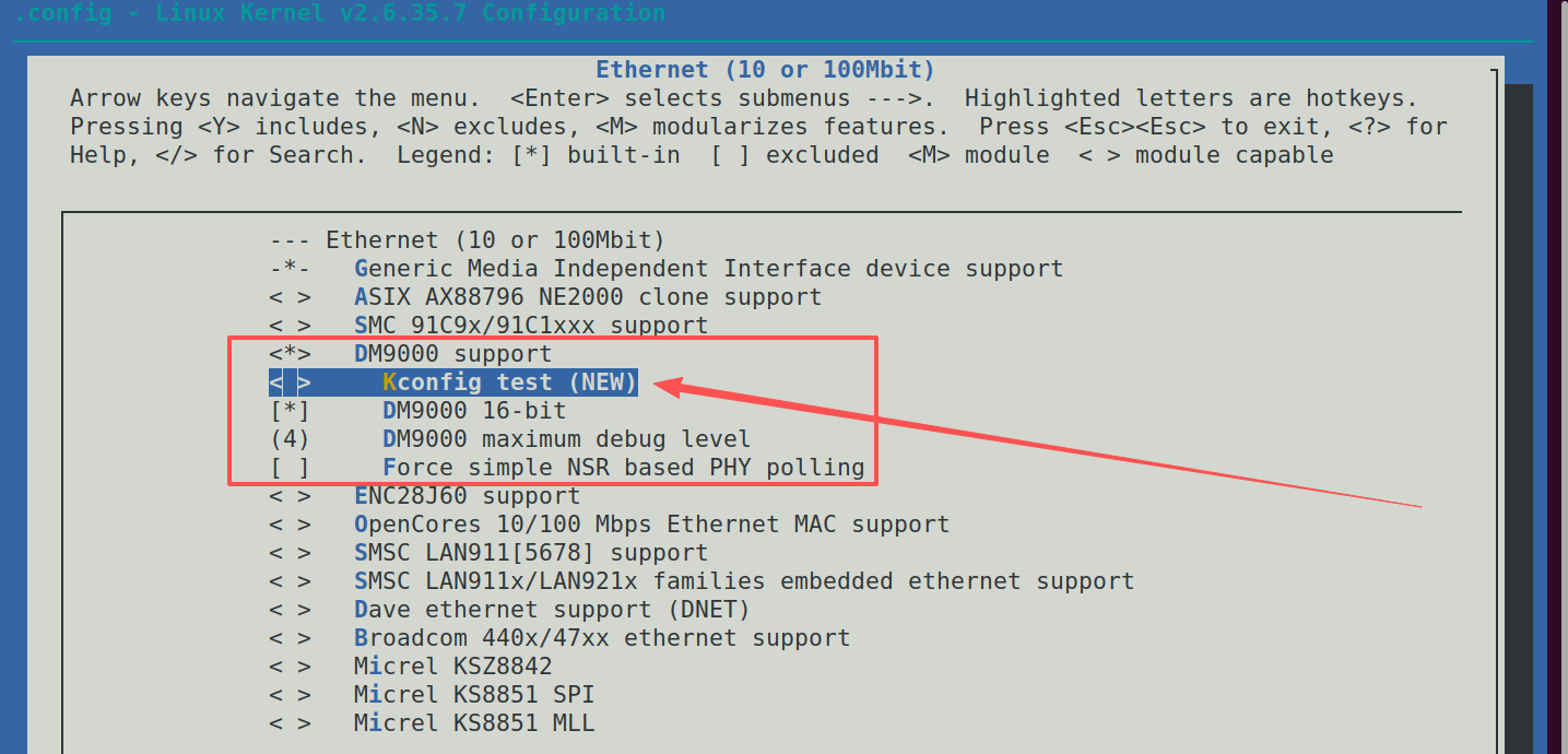复制一份DM9000的配置文件下来,改名称为LXY3080Ti,展示名称Kconfig test,依赖于DM9000,自动选择......