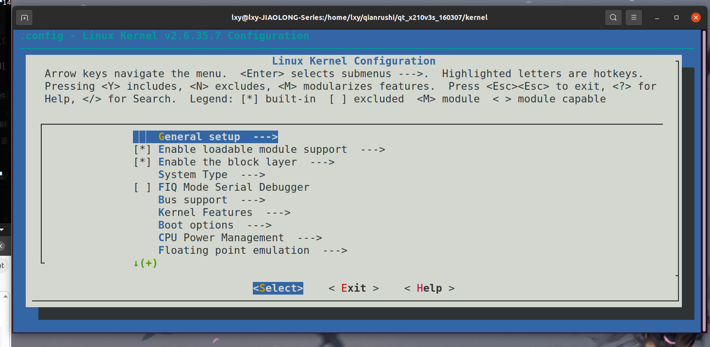 箭头导航菜单,选项结尾有(-->)的可以进入子菜单,高亮的字母是快捷键,Y键编入,N键去除,M键模块化,?表示帮助,/表示全局搜索。*表示已编入,空白表示去除,M表示已模块化, [ ]表示只可以包含或者去除,<>表示可以被模块化编译。