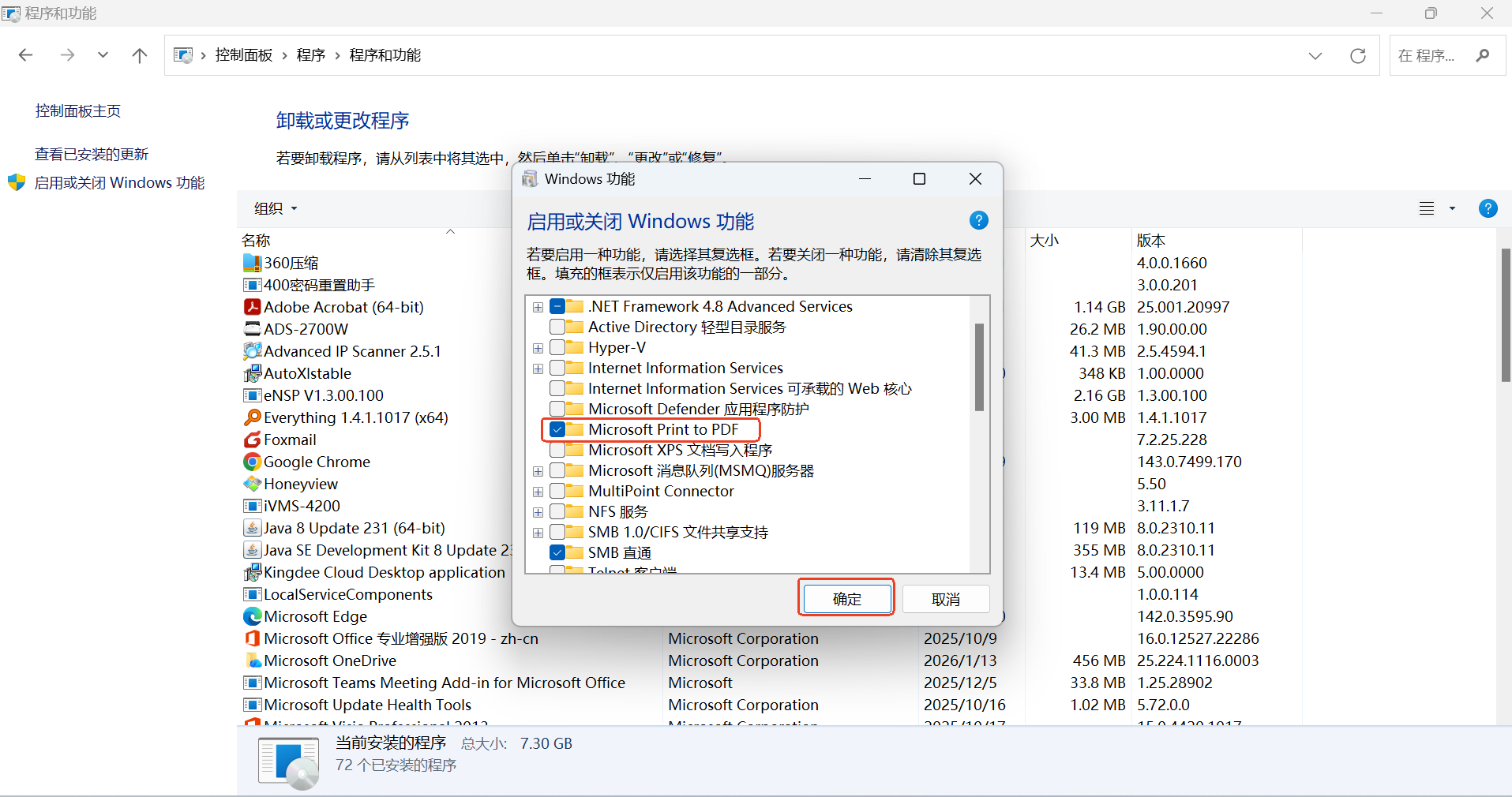 找到Microsoft Print to PDF,如果没有勾选请勾选,点击确定