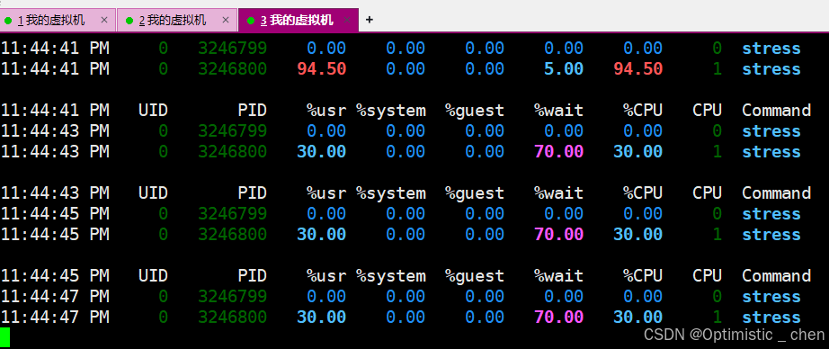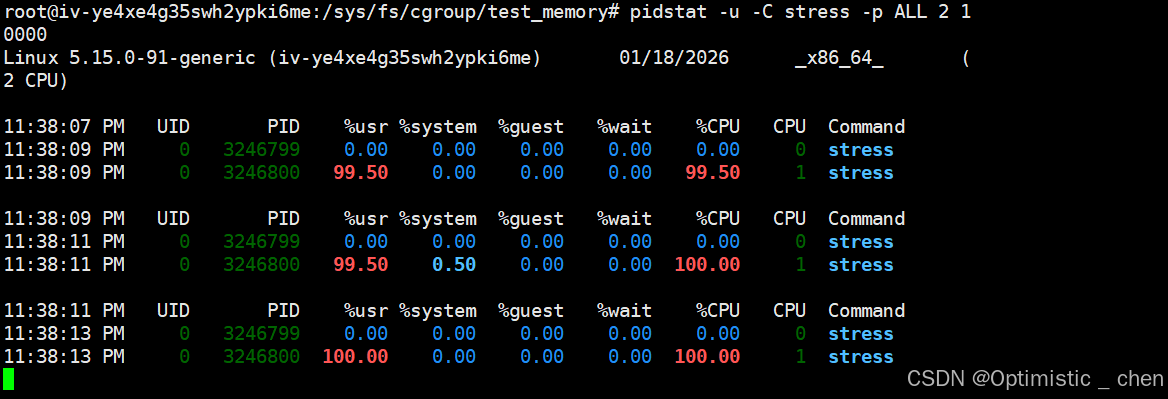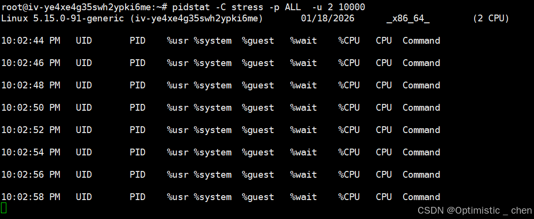 pidstat -C stress -p ALL -u 2 10000