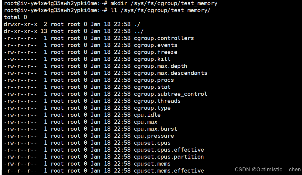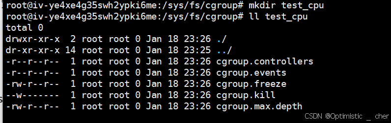 我们先进入到挂载点/sys/fs/cgroup/,创建test_cpu,通过ll命令可以看到系统自动帮我们创建cgroup的cpu策略。