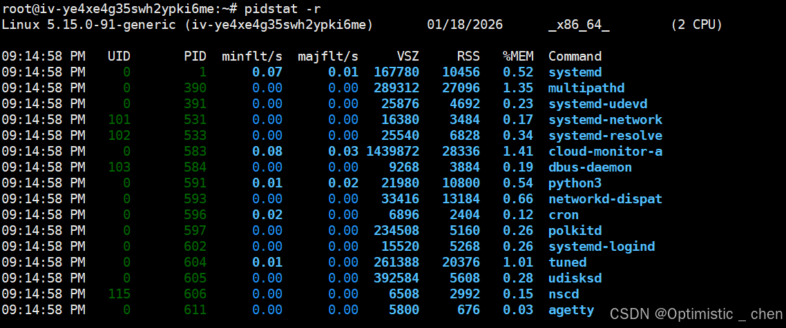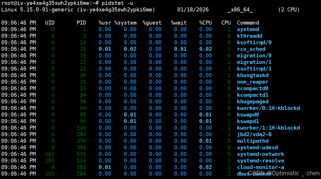 pidstat 是systat的一个命令,用于监控全部或者指定进程的CPU、内存、线程、设别IO等系统资源的占用情况。