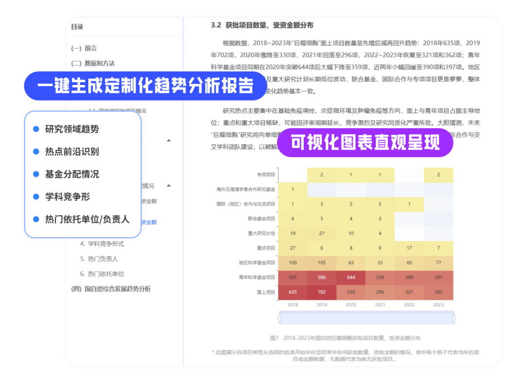 - 同时通过知识图谱生成趋势报告 ,帮你锁定热门细分方向 ,既贴合优先资助领域,又避开同质化雷区,让选题从源头就具备竞争力。