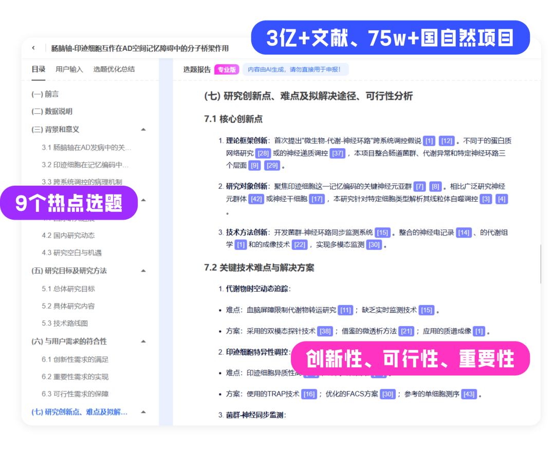 - 更核心的是AI项目选题功能 ,当你输入自己的研究方向后,AI会基于3亿+全学科文献和75w+国自然获批项目,精准推荐兼具创新性和可行性的选题;